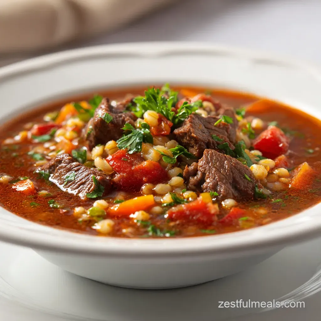 Simmer the beef gently for at least 1 hour 30 minutes before adding the barley, and continue simmering for another 45-50 minutes after adding the grain. The key is maintaining a low temperature just below boiling; if you boil the beef vigorously, the muscle fibers tighten up and the meat becomes tough.