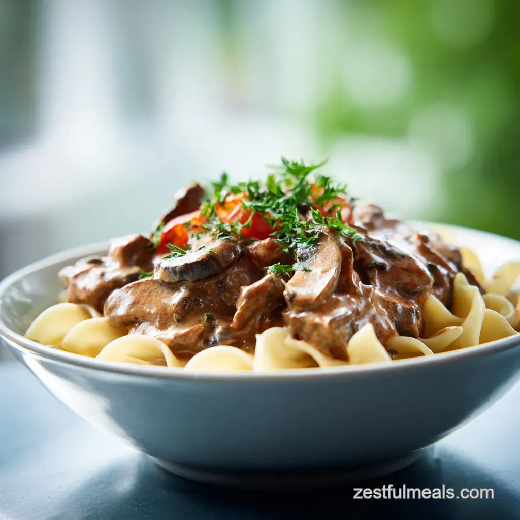 - Flavor/Texture Hook: A velvety, tangy sauce coating tender strips of beef with a smoky paprika finish.